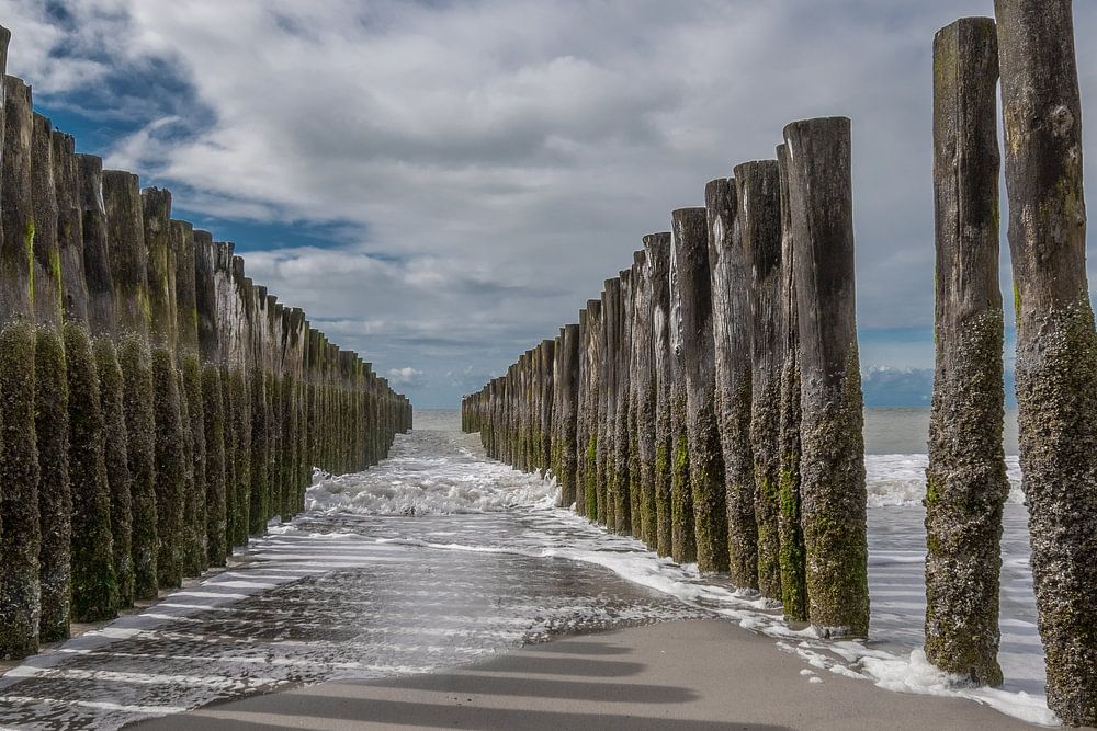 Deze prachtig opgelijnde golfbrekers gefotografeerd met groothoeklens, verdwijnend in de horizon zijn in beeld gebracht aan het strand van Renesse te Zeeland.