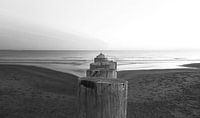 De bekende strandpalen, oftewel, golfbrekers op de stranden van Zeeland in zwart en wit.