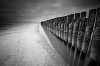 Een rij paaltjes aan de Nederlandse kust vormen een golfbreker op het strand. Een zwart wit beeld van de zee, met een bewolkte lucht en een diagonale rij palen voor dynamische diepte.