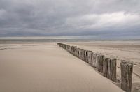 Een rijtje paalhoofden op het Noordzeestrand van het Nederlandse Waddeneiland Ameland ter hoogte van Hollum. Het zijn golfbrekers om afkalving van strand tegen te gaan. De palen zijn voor velen een geliefd onderwerp om te fotograferen. Het is een bewolkte dag met veel wind.