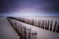Golfbrekers aan de Nederlandse kust op een bewolkte dag. De foto is genomen met een lange sluitertijd. De lucht wordt hierdoor lekker drastisch. Het licht is erg zacht waardoor de schaduwen niet te hard worden. De palen staan diagonaal door het beeld, waardoor het geheel dynamisch word.