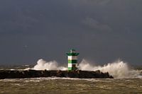 Golfen slaan over de zuidpier van Scheveningen waar de groene vuurtoren stand houdt