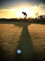 De foto toont een golfer op een golfbaan tijdens zonsondergang. De zon staat laag aan de horizon en werpt een warm licht over het gras. De golfer is vastgelegd als silhouet, met een lange schaduw die zich uitstrekt over de fairway. Hierdoor ontstaat een duidelijk spel van licht en donker dat het beeld structuur geeft.
