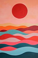 Een krachtige zonsondergang over zachte golven, vlammend rood harmonieert met zachte blauwe en roze tinten. Deze levendige kleuren creëren een rustgevende sfeer, perfect voor een woonkamer of een creatieve studeerkamer. Het beeld nodigt uit om te dromen en verandert elke kamer in een plek van ontspanning en inspiratie.