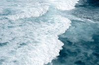 De foto toont een ruwe zee, met golven die kracht en beweging uitstralen. De dominantie van de kleur blauw varieert van diep en donker in de diepten van de golven tot helder en bijna doorschijnend waar het zonlicht de toppen raakt. Opvallend is de textuur van het wateroppervlak, dat zowel ruig als uitnodigend lijkt, een visuele weergave van de natuur op haar meest ongetemde momenten. Schuimkoppen op de golven geven de intense energie van de zee weer.