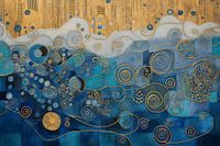 Dit werk toont een dynamische compositie van golvende lijnen en spiraalvormige patronen in blauwe en gouden tinten. De interactie tussen de golvende en circulaire vormen creëert een gevoel van beweging en energie. De inspiratie komt van natuurlijke elementen zoals water en lucht, wat een rustgevende en tegelijk levendige sfeer geeft.