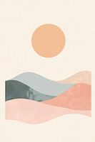 Zachte golven in zachte pastelkleuren harmoniëren met een grote, warme cirkel van zonlicht die de hemel verlicht. De gebogen vormen geven een gevoel van rust en sereniteit, terwijl de minimalistische achtergrond de tijdloze schoonheid van de natuur weergeeft. Dit harmonieuze samenspel van kleuren en vormen nodigt uit tot dromen en verwijlen.
