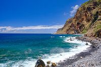 Golven slaan op de kust van Madeira eiland in Portugal bij de boulevard van het dorp Jardim do Mar aan de zuidkust tijdens een mooie zomerdag.