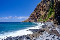 Golven slaan op de kust van Madeira eiland in Portugal bij de boulevard van het dorp Jardim do Mar aan de zuidkust tijdens een mooie zomerdag.