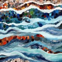 Een mozaïek van levendige kleuren dat lijkt op een gestileerde, abstracte voorstelling van water en kiezels of stenen. Golven van blauw, wit en groen vermengen zich met ronde vormen in verschillende tinten en geven beweging en vloeibaarheid weer.