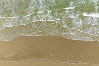 Golven die het strand raken aan de Noordzeekust in Nederland, gezien van bovenaf.