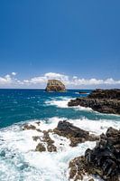 Golven slaan tegen de noordkust van het eiland Madeira bij Porto da Cruz in het midden van de Atlantische Oceaan tijdens een mooie zomerdag. Madeira is een archipel gelegen in de Noord-Atlantische Oceaan en is een autonome regio van Portugal.