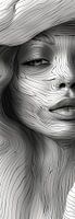 Golven van Elegant Lijnenspel presenteert een verbluffende weergave van een vrouwelijk gezicht, bedekt door een grote hoed, in verfijnde lijnkunst. De vloeiende lijnen lopen harmonieus over haar gelaatstrekken en de hoed, waarbij elk detail zorgvuldig is uitgestippeld om een gevoel van diepte en beweging te creëren. De minimalistische benadering versterkt de intrigerende expressie en de mystieke uitstraling van de vrouw.