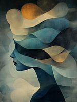 intrigerende mix van abstractie en portretkunst, waarin het silhouet van een vrouw subtiel verweven is met golvende vormen en lagen. De compositie speelt met een harmonieuze kleurenpalet van blauw-, geel- en aardetinten, die elkaar overlappen in transparante en organische patronen. De lijnen suggereren een zachte beweging, alsof wind of water de vormen voortdrijft.