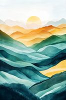 Dit kunstwerk toont een sereen berglandschap met vloeiende vormen. Warme gouden tinten van de opkomende zon contrasteren met koele groene en blauwe bergen, wat diepte en ruimte creëert. De zachte kleurovergangen roepen een dromerige sfeer op, terwijl het werk rust en harmonie uitstraalt. Het combineert abstractie met herkenbare landschapsvormen, resulterend in een moderne, contemplatieve interpretatie van een berglandschap bij zonsopgang.