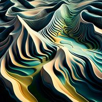 Waves of Earth and Sky heeft een abstract landschap dat bestaat uit golvende, gelaagde lijnen die naadloos over de compositie vloeien. Zachte blauwtinten smelten samen met warme aardetinten om een gevoel van beweging en diepte op te roepen, waardoor een harmonieuze mix van natuurlijke elementen ontstaat in een fantasierijk, vloeiend ontwerp. Dit stuk is ideaal voor moderne interieurs en creëert een rustgevend en toch dynamisch visueel accent.