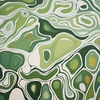 abstracte weergave van organische vormen in een vloeiend patroon dat doet denken aan natuurlijke landschappen of biologische structuren. Het kleurenpalet bestaat uit verschillende tinten groen, aangevuld met witte accenten en kleine hints van goud en geel. De lijnen en vormen overlappen elkaar in golvende bewegingen, wat het gevoel van dynamiek en verbinding versterkt. De compositie roept associaties op met rivierdelta’s, boomkronen of celstructuren, terwijl het abstract genoeg blijft om ruimte te bieden voor interpretatie.