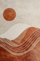 Dit werk toont een abstracte weergave van een woestijnlandschap, met golvende lijnen die de contouren van de zandduinen volgen. De warme tinten van rood en beige worden aangevuld met een grote, ronde zon aan de horizon, wat een gevoel van warmte en stilte uitstraalt. De vloeiende lijnen en zachte kleuren creëren een serene en harmonieuze sfeer, ideaal om rust en balans in een ruimte te brengen.