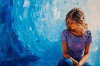Te midden van een zachte oceaan van blauw en wit belichaamt de jonge vrouw een stille melancholie. Haar afwezige blik en de zachte golven achter haar weerspiegelen innerlijke gedachten. De delicate weerkaatsing van het licht op haar haar maakt de sfeer dromerig en verleent de scène een bijna hypnotiserende diepte.