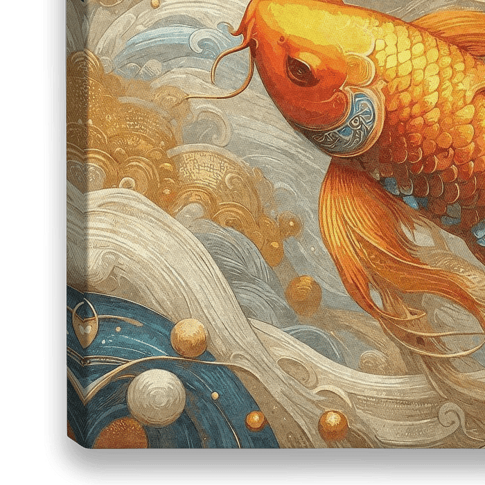 Twee kunstig vormgegeven koivissen glijden door een dynamisch aquatisch universum van blauw, goud en licht. Hun elegante bewegingen symboliseren kracht, harmonie en spirituele groei. De gouden bollen en vloeiende golven geven het getextureerde beeld een mystiek aura dat wijsheid uit het Verre Oosten combineert met moderne…