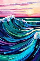 Levendige golven dansen in het zachte licht van de zonsondergang, terwijl glinsterende blauwe en groene tinten harmonieus in elkaar overgaan. De gedurfde penseelstreken brengen een dynamische energie over die tegelijkertijd rust en beweging belichaamt. Ideaal voor een woonkamer om een ontspannende, maritieme sfeer te creëren en je uit te nodigen om te dromen.