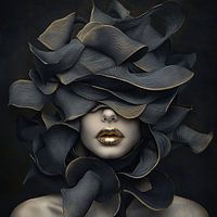surrealistisch portret van een vrouw, waarbij haar gezicht gedeeltelijk wordt bedekt door een complexe structuur van kronkelende lintachtige vormen. Deze vormen lijken op bloembladen of golvende stof, die het gezicht omhullen en een gevoel van mysterie en elegantie oproepen. De kleur van deze linten is een diep grijs met subtiele gouden randen, wat een luxueuze uitstraling geeft en een prachtige balans creëert tussen donker en licht.