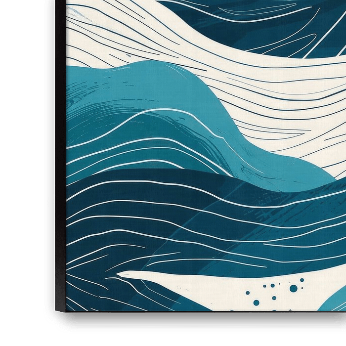 Diepblauwe en aquagroene kleuren deinen harmonieus samen in zachte golven en roepen de kalmerende omarming van de zee op. Elegante, gebogen lijnen lopen door het dynamische landschap en geven een gevoel van beweging en leven, terwijl heldere accenten het samenspel van licht en water benadrukken. Een meesterwerk van rust en dynamische natuur!
