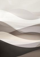 Subtiele en serene compositie van vloeiende, overlappende vormen die doen denken aan golvende zandduinen of zachte mistige heuvels. De kleuren variëren van lichte beige- en crèmetinten tot diepere bruin- en grijstinten, die harmonieus in elkaar overlopen en een gevoel van rust en eindeloosheid creëren. De gladde, bijna zijdezachte overgang tussen de verschillende lagen geeft het beeld een etherische kwaliteit, alsof de vormen in beweging zijn, maar tegelijkertijd bevroren in de tijd.