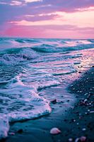Een prachtig beeld van een serene zonsopgang aan de kust. Het zachte roze en paars van de lucht weerspiegelt in de rustige golven, terwijl de details van schelpen en zand zorgen voor een rustgevende en natuurlijke uitstraling. Dit ontwerp is perfect voor een sfeervol interieur en brengt een kalme, ontspannen sfeer in elke ruimte.