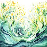 De kunstenaar heeft met expressieve penseelstreken en kleuren een suggestieve interpretatie van een wilde plantenveld gecreëerd, waarbij de nadruk ligt op de warme tinten groen en geel die typerend zijn voor de zomer.