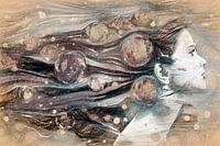 Abstract portret van een vrouw met lang golvend haar. Mixed media schilderij met grove afgebladderde verf structuur in bruin,grijs en paarse tinten. Fantasie kunst