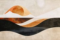 Dit kunstwerk is een visueel genot voor liefhebbers van minimalistisch design en warme, natuurlijke kleuren. De abstracte vormen, die doen denken aan golven of heuvels, zijn uitgevoerd in zachte aardetinten en creëren een rustige, doch dynamische compositie. De subtiele overgangen tussen de kleuren oranje, bruin, beige, zwart en wit roepen de sfeer op van een zonsondergang die zich afspeelt in een ongedefinieerde, droomachtige wereld. Dit stuk zou niet misstaan in een modern interieur waar het kan dienen als een stijlvolle blikvanger of als een complementair onderdeel van een ingetogen kleurenpalet. Het ontwerp biedt een rustgevend tegenwicht tegen de drukte van alledag en nodigt uit tot contemplatie en innerlijke rust.