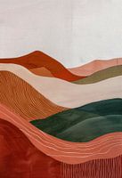 Dit werk toont een reeks golvende heuvels in verschillende tinten rood, oranje, groen en beige. De soepele lijnen en zachte kleuren geven de afbeelding een rustgevende en ritmische uitstraling. De contrasten tussen de warme en koele tinten zorgen voor een harmonieuze balans die de natuurlijke vormen van het landschap benadrukt.