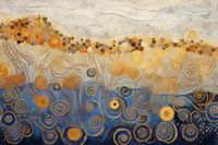 Dit werk toont een compositie van golvende lijnen en cirkelvormige patronen. De bovenkant bestaat uit een verzameling van kleine cirkels in warme tinten van goud en oranje, terwijl de onderkant diepblauwe spiralen en lijnen bevat. De golvende lijnen creëren een gevoel van beweging en contrast tussen de verschillende kleuren.
