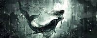 De dominante kleuren zijn verschillende tinten grijs en groen, wat een serene en enigszins melancholische sfeer creëert. De zeemeermin, met haar sierlijke staart en lange, golvende haar, lijkt alsof ze door een etherisch…