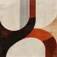 Dit werk vangt de blik met zijn golvende zwarte lijn die door de heldere crèmekleurige ruimte snijdt, geflankeerd door rijke terracotta segmenten en strakke verticale strepen. De combinatie van curven en strakke lijnen maakt het een aantrekkelijk stuk voor een ruimte die speelt met traditionele en moderne esthetiek. Het kan een rustige, maar krachtige uitstraling geven aan een eetkamer, woonkamer of een ontvangsthal.