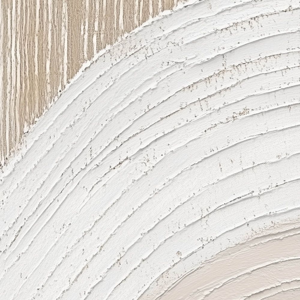 Eenvoudige maar doeltreffende compositie van texturen en aardse kleuren. Het beeld is verdeeld in twee delen, waarbij de bovenkant uit verticale lijnen in een zandkleur bestaat en de onderkant uit vloeiende, gebogen lijnen in zachte tinten wit en beige. De lijnen zijn dik en tastbaar, en voegen een gelaagd gevoel toe aan het werk. Het contrast tussen de strakke, rechte lijnen boven en de zachte, golvende vormen beneden zorgt voor een boeiend visueel spel tussen orde en organische beweging.