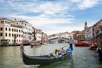 Een gondel vaart over het Canal Grande (Grote Kanaal) in Venetië, Italië, de levensader van Venetië. In de achtergrond is de Rialtobrug zichtbaar. De Rialtobrug ( Ponte di Rialto) is de oudste en bekendste van de vier bruggen over het Canal Grande.