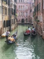 Gondels door de nauwe straatjes en steegjes door Venetie in Italie. Samen met de zon maakt het een zachte gloed.