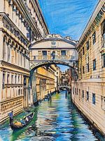Een kleurrijke illustratie toont een gondel die door een smal kanaal in Venetië glijdt. De iconische Brug der Zuchten overspant de waterweg en verbindt twee hoge gebouwen met sierlijke gevels. Langs het kanaal staan gebouwen in warme geeltinten die de blauwe lucht en het kabbelende water weerspiegelen.