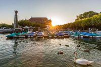 Zwaan ( Knobbelzwaan ) voor de Raad en boten in de gondelhaven van Konstanz aan het Bodenmeer bij zonsondergang, Baden-Württemberg, Duitsland