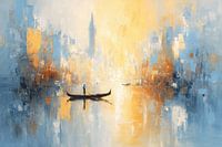Een abstract olieverfschilderij toont een gondelier die zachtjes door de Venetiaanse lagune roeit. Op de achtergrond doemen de silhouetten van de stad op in zachte blauw- en goudtinten. Delicate penseelstreken en subtiele lichtreflecties op het wateroppervlak creëren een kalme, bijna meditatieve sfeer. Het harmonieuze kleurenpalet en de vloeiende vormen geven het schilderij een elegante diepte en tijdloze sfeer - een poëtisch eerbetoon aan de schoonheid van Venetië en het zachte samenspel van licht en water.