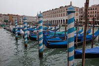 Gondels met blauwe zeilen in het grote kanaal in Venetië, Italië.