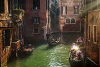 Het is nog vroeg in de morgen en Gondeliers maken zich klaar voor de eerste toeristen in de nauwe kanalen van de Italiaanse stad Venetië. Het ochtendlicht weerkaatst op het groene water.