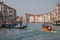 Gondola an speedboot op kanaal in centrum van oude stad Venetie, Italie