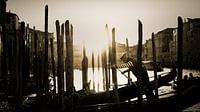 Gondelier in Venetië die zijn gondel gaat aanleggen aan de wal. De opname is gemaakt met de zon direct achter het onderwerp waardoor het silhouet mooi afsteekt tegen de achtergrond.