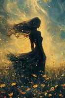 Dit schilderij toont een mysterieuze vrouwelijke figuur die danst temidden van een kleurrijk veld met gele bloemen. Haar lange, golvende haren wapperen wild door de wind, die ook de bloemblaadjes doet opwaaien in een schilderachtige draaikolk. De sfeer is dromerig en betoverend, met een gevoel van eenheid met de natuur.