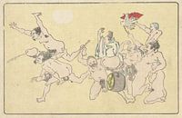 Humoristisch erotische prent; groep naakte mannen en een geklede hoveling, twee rennende mannen aanmoedigend; bij het slaan van een gong, hangend aan een penis.