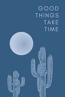 Blauwe poster met cactussen en de zon en de tekst/quote good things take time