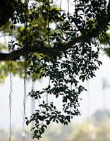 Een tak met kleinere zijtakjes en veel kleine blaadjes die als een sluier naar beneden hangen. Een botanische plaat met veel groen.